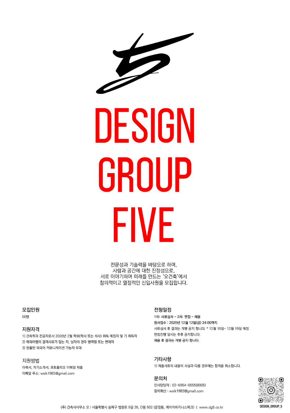 fnctId=bbs,fnctNo=1203 [건축사사무소 오] 2026년도 신입챙용 모집 안내(~12/12까지) 글번호 415736 작성일 2025-12-01 수정일 2025-12-01 작성자 도시건축학부 (032-835-8470) 조회수 13 첨부파일 첨부파일이(가) 없습니다. 다음글 이전글 (주)해량엔지니어링종합건축사사무소 신입사원 모집 공고 이천지 2025-12-01 09:00:47.0 목록