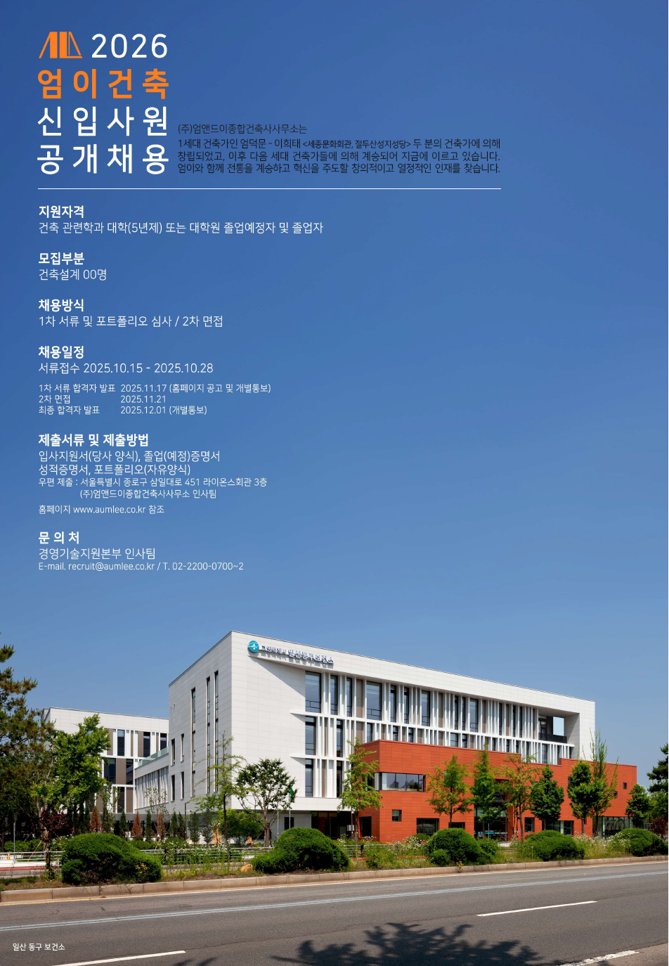 fnctId=bbs,fnctNo=1203 [엄앤드이종합건축사사무소] 2026 신입사원 공개채용(10/15~10/28) 글번호 413144 작성일 2025-09-26 수정일 2025-09-26 작성자 도시건축학부 (032-835-8470) 조회수 683 첨부파일 첨부파일이(가) 없습니다. 다음글 [(주)친환경계획그룹청연] 2026 신입사원 채용공고(10/20~11/14) 유재영 2025-10-02 10:16:58.0 이전글 [삼성물산] 아르바이트 채용 공고 정혜진 2025-09-15 10:28:27.0 목록