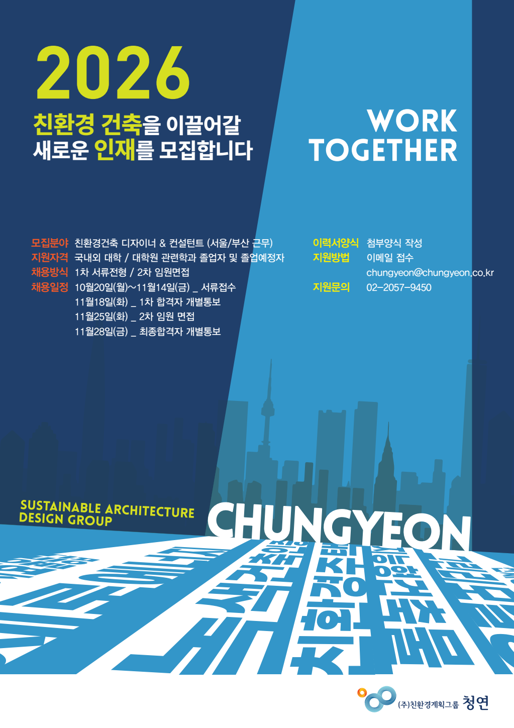 fnctId=bbs,fnctNo=1203 [(주)친환경계획그룹청연] 2026 신입사원 채용공고(10/20~11/14) 글번호 413451 작성일 2025-10-02 수정일 2025-10-02 작성자 도시건축학부 (032-835-8470) 조회수 551 첨부파일 첨부파일이(가) 없습니다. 다음글 [강남건축] 2026 신입사원 공개채용 (~10/24) 유재영 2025-10-02 10:20:20.0 이전글 [엄앤드이종합건축사사무소] 2026 신입사원 공개채용(10/15~10/28) 유재영 2025-09-26 11:21:57.0 목록