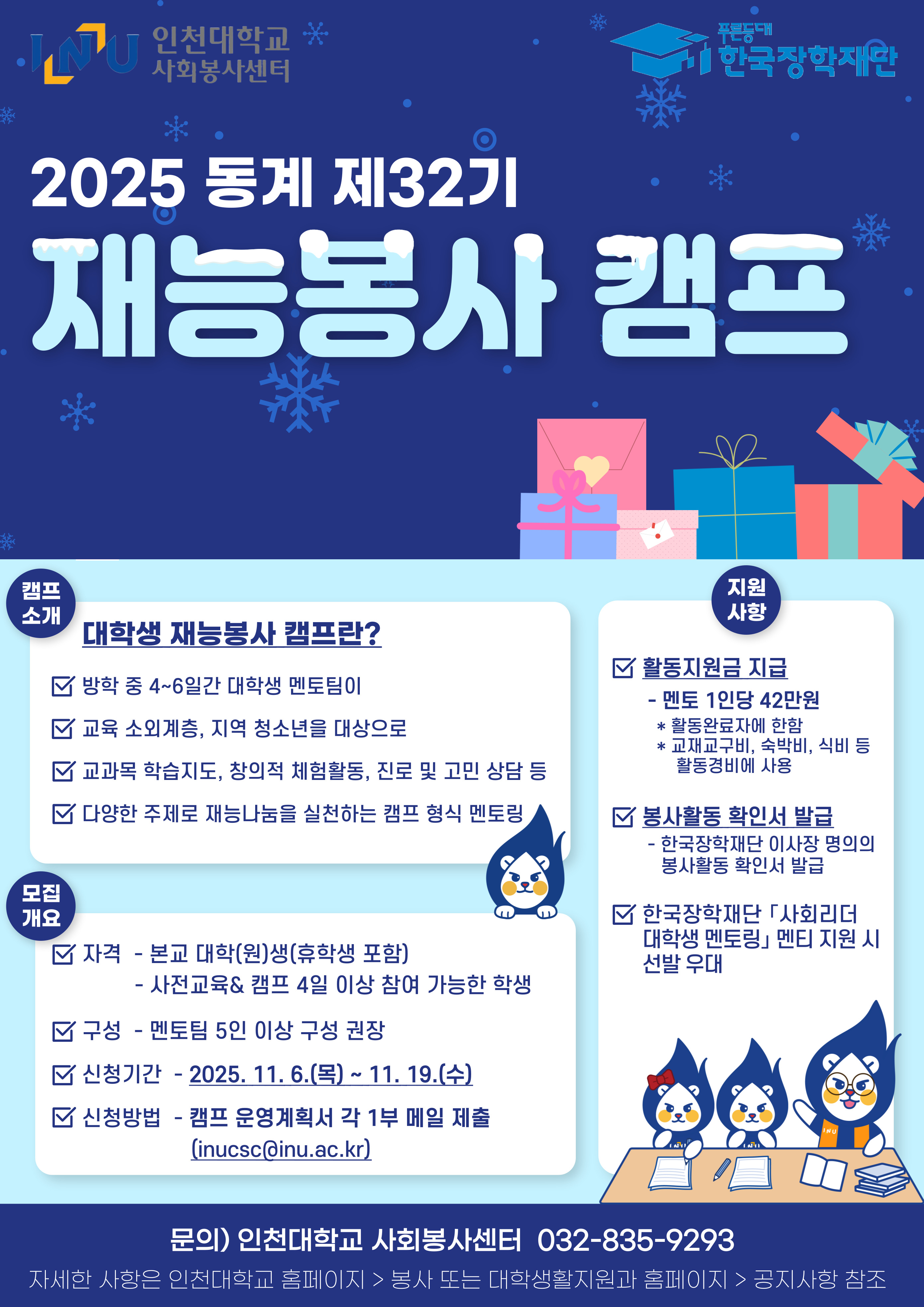 한국장학재단 「2025학년도 제32기 동계 대학생 재능봉사 캠프」를 진행하고자 아래와 같이 재능 봉사 멘토팀을 모집하오니 많은 관심과 참여바랍니다.