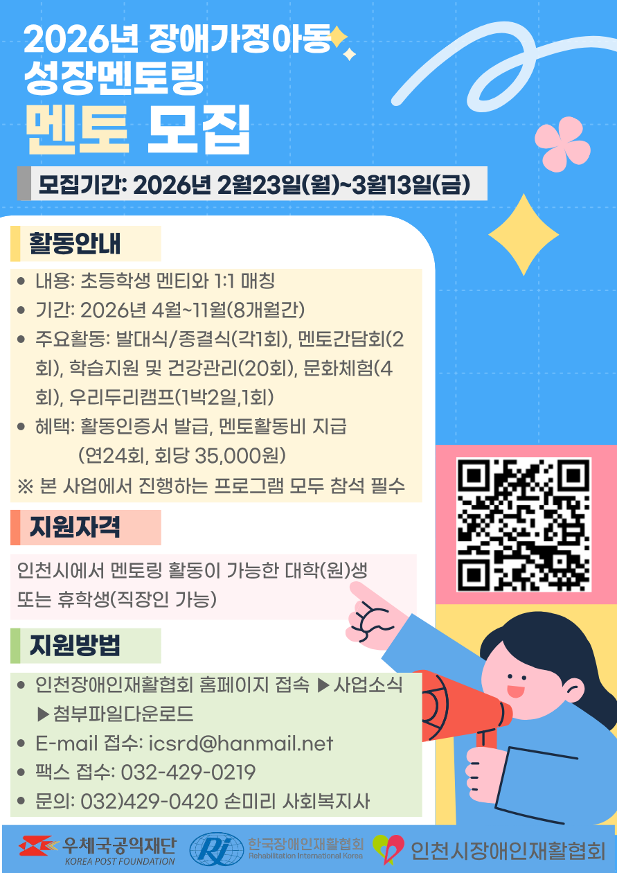 [사회봉사] 인천광역시장애인재활협회 「2026년 장애가정아동 성장멘토링」 대학생 멘토 모집