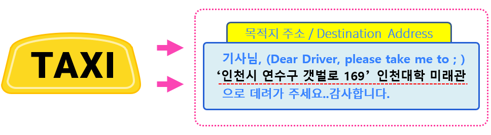 - For using TAXI, show this address to the TAXI driver. 택시 기사분께 아래 목적지 주소를 보여 주세요.