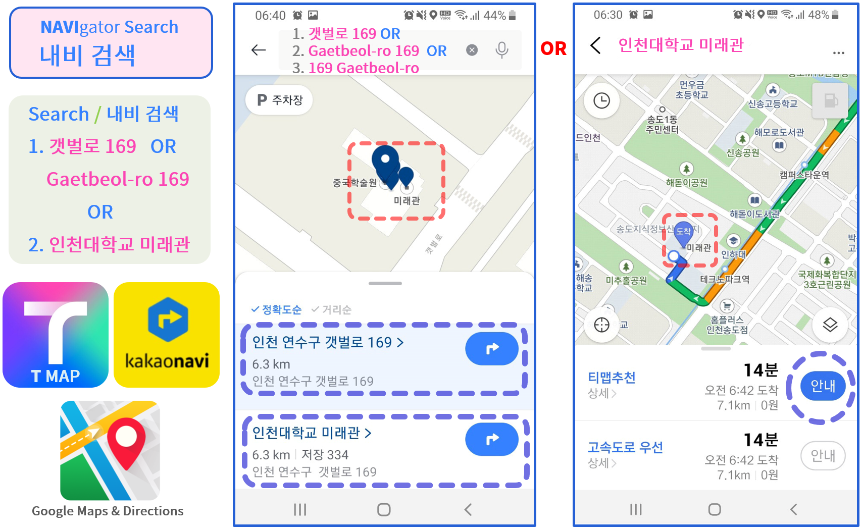 T MAP, Kakao Navi, Google Map & Direction, etc.